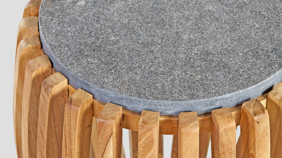 Featuring a beautiful curved A grade teak fin design, with a solid stone top, this will look equally nice indoor as it will outdoor.