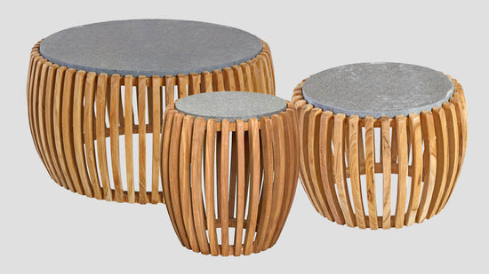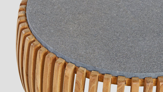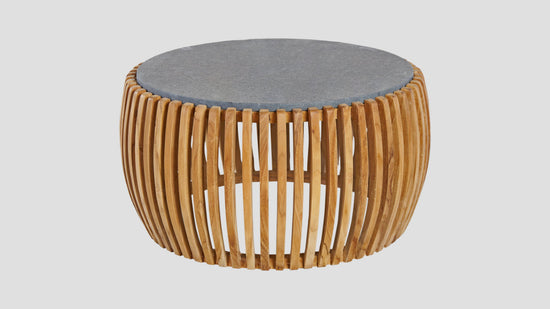 Featuring a beautiful curved A grade teak fin design, with a solid stone top, this will look equally nice indoor as it will outdoor.